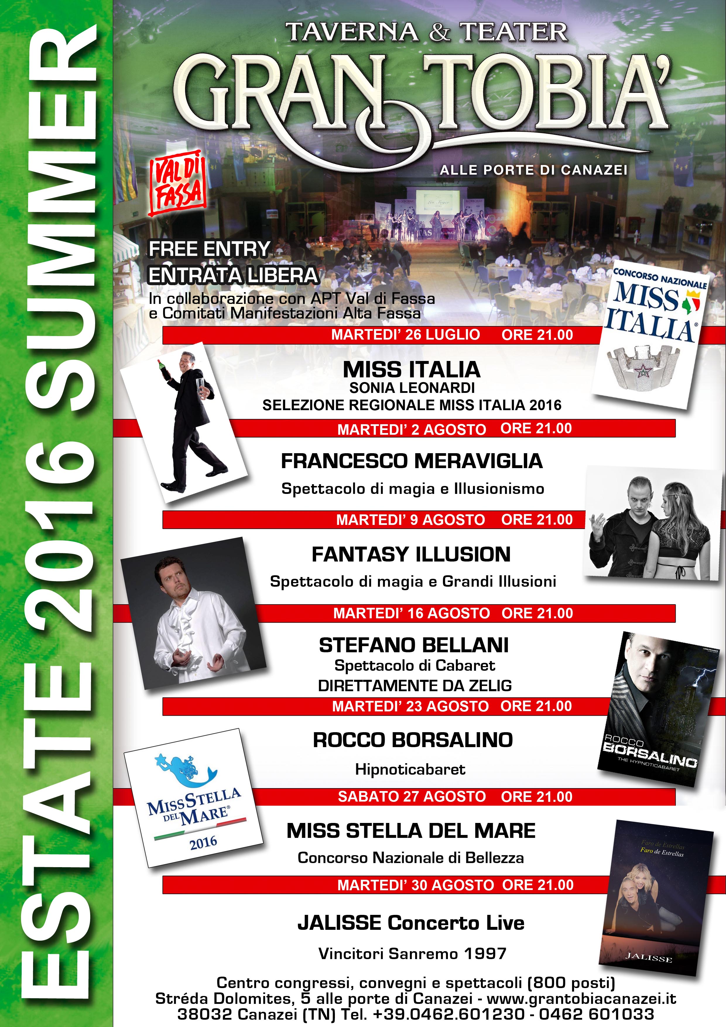 Calendario Estate 2016 del Gran Tobià Taverna & Teater Cabaret Magia Musica a Canazei in Val di Fassa sulle Dolomiti in Trentino Alto Adige